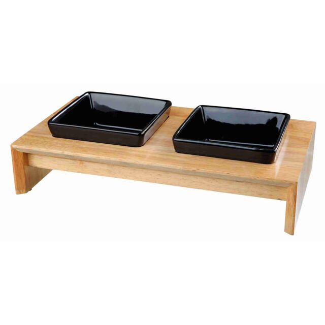 Keraminių dubenėlių komplektas - 2 keraminiai dubenys su stovu. Sunkus stovas pagamintas iš lakuotos kietmedžio (kaučiukmedžio). Tylus triukšmo lygis ir tvirtas laikymas dėl silikoninių rankenėlių tarp dubens ir stovo. Neslysta dėl guminių kojelių. Dubenėlius galima plauti indaplovėje.