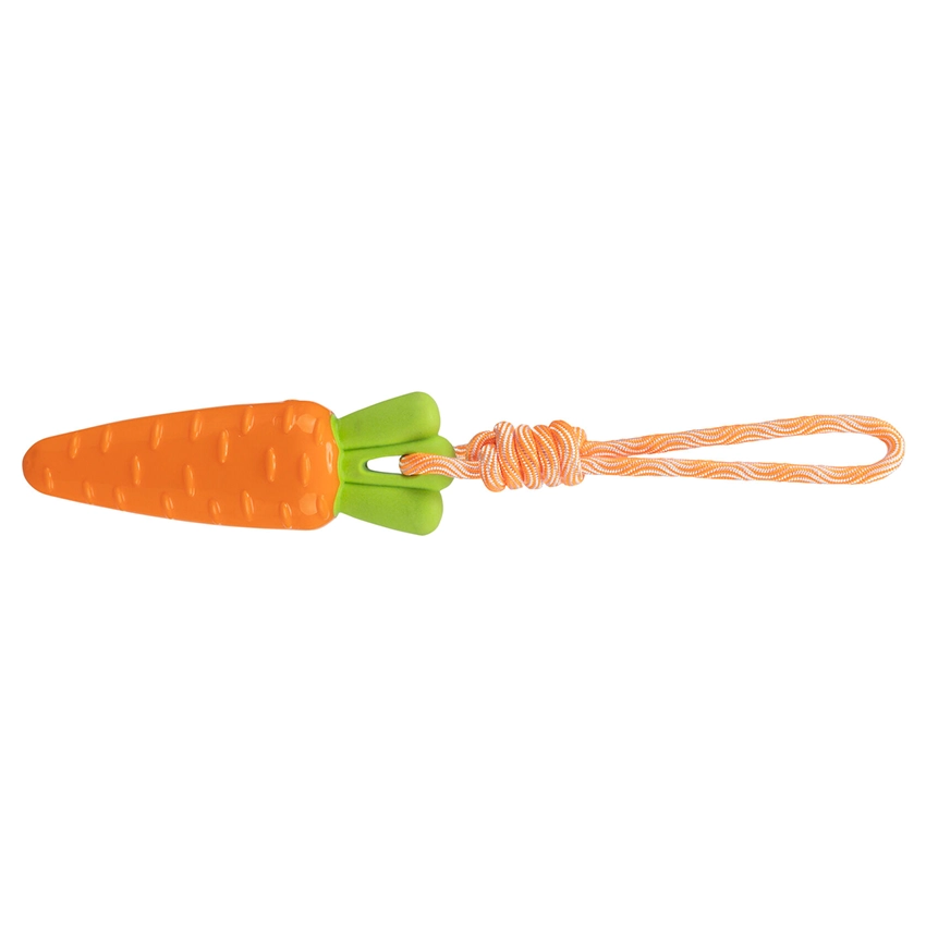 Žaislas šunims - morka ant virvės; su garsu. Medžiaga: termoplastinė guma (TPR)/poliesteris.