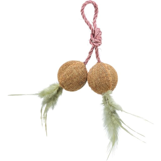 Žaislas katėms - du džiuto kamuoliukai ant virvės. Pagaminta iš pliušo; su plunksnomis ir kačių mėta.