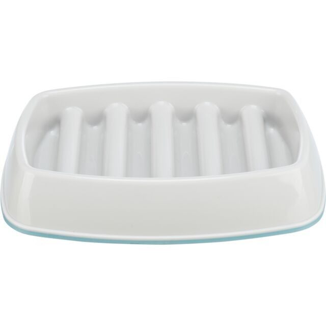 Lėto ėdimo negilus dubenėlis katėms. Neleidžia per greitai nuryti maisto; tinka visų tipų pašarams; neslysta dėl guminio pagrindo žiedo. Išbandyta nepriklausomos ekspertų įstaigos dėl gyvūnų gerovės ir apsaugos.