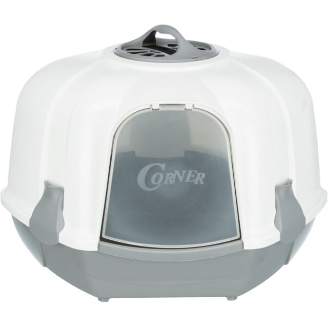 Plastikinis kampinis tualetas namelis katėms, 60x43x52 cm. Su lopetėle, su aktyvintos anglies filtru bei lengvai užspaudžiamais užsegimais.